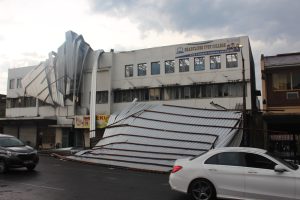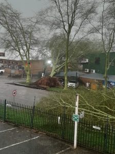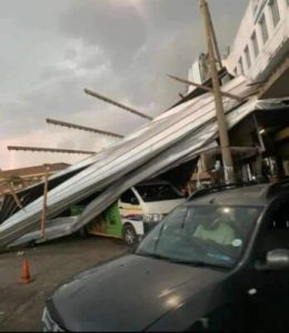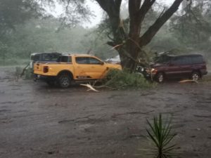 Strong winds, heavy rain, lightning and thunder hit the city just before 15:00 today, November 21, resulting in the uprooting of trees, flooding – including the R40 near Riverside, collapsed lamp posts, and even signage of buildings being blown off.